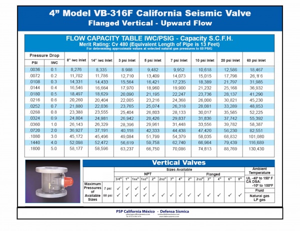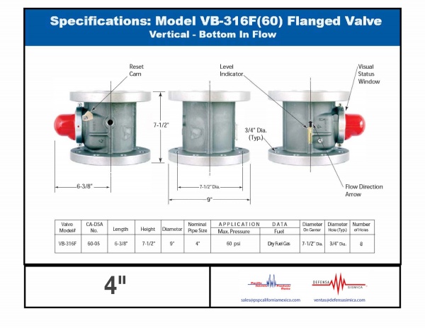 Our PSP California Earthquake actuated gas shut off valve Model VB315F is a vertical flow valve with a 3" diameter with NPT thread. It is recommended for industrial applications. Such earthquake valve is disgned to work with natural gas or LP gas in a pressure range below 60psi (4kg/cm2).