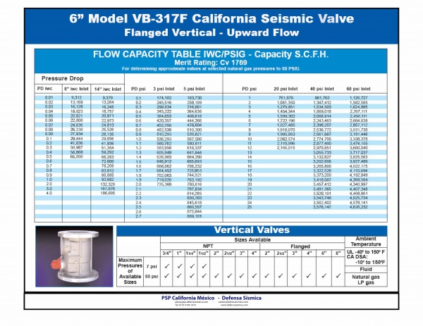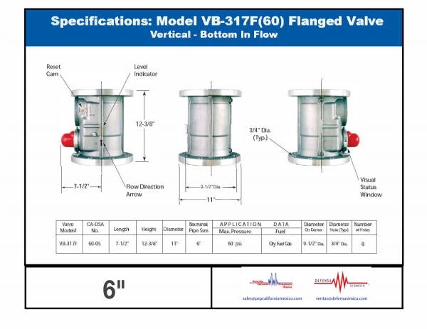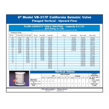 Our PSP California Earthquake actuated gas shut off valve Model VB317F  is a vertical flow valve with a  6" diameter  with NPT thread. It is recommended for industrial applications. Such earthquake valve is disgned to work with natural gas or LP gas in a pressure range below 60psi (4kg/cm2).