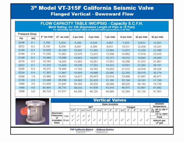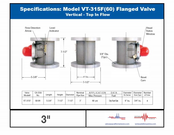 Our PSP California Earthquake actuated gas shut off valve Model VB315F is a vertical flow valve with a 3" diameter with NPT thread. It is recommended for industrial applications. Such earthquake valve is disgned to work with natural gas or LP gas in a pressure range below 60psi (4kg/cm2).